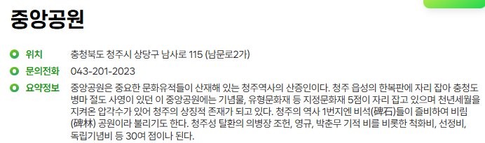 도심 한복판에 위치한 역사적 공간으로, 청주읍성의 흔적을 느낄 수 있습니다. 조선시대부터 현대에 이르기까지 청주의 변천사를 볼 수 있으며, 주변에는 향교, 옛 관청 건물 등도 있어 역사 산책 코스로 좋습니다.