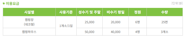 또한, 자연 속에서 캠핑을 생각하시는 분들은 아래 요금을 확인하시고, 미리 예약을 진행하시면 좋습니다.